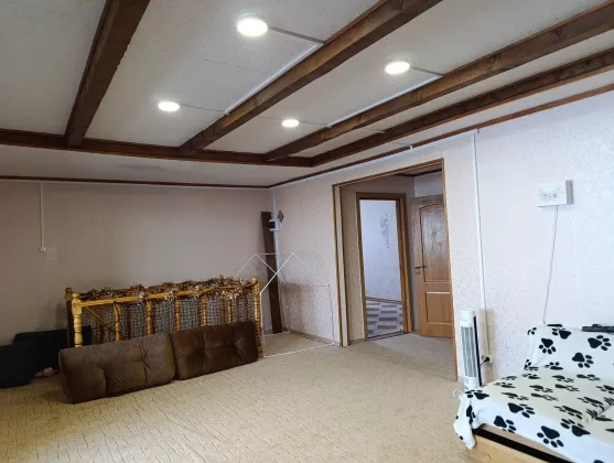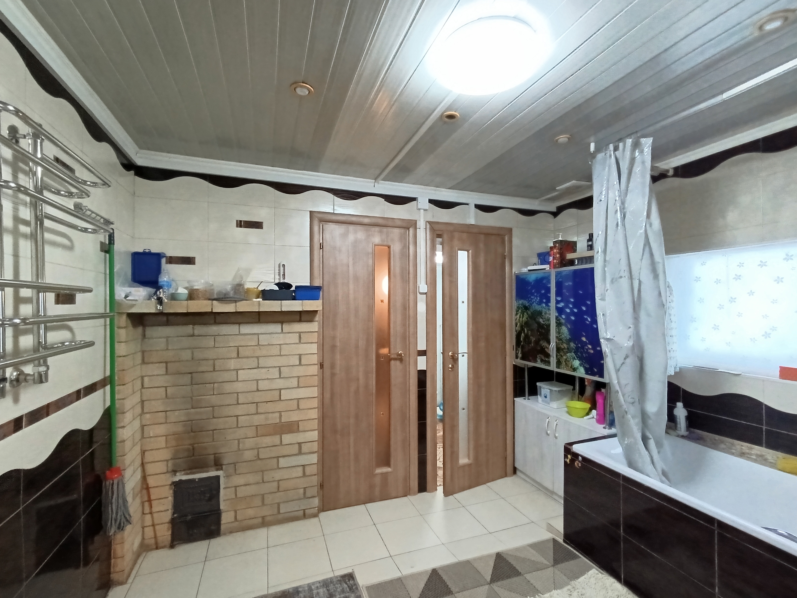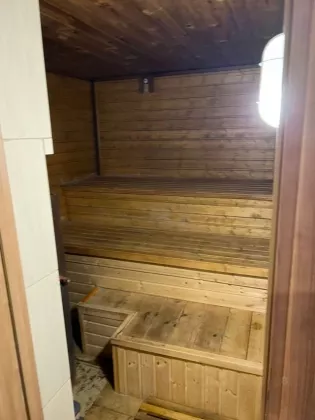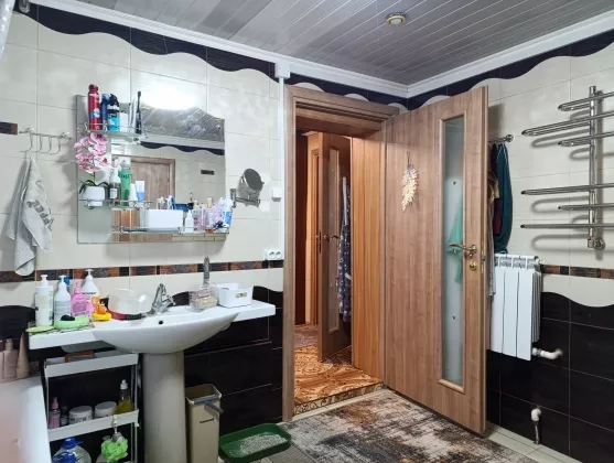 Первый этаж: коридор, сан. узел, ванная комната с сауной, кухня (везде теплые водяные полы), гостиная - теплые электрические полы, спальня, гардеробная комната, рабочий кабинет, тепловой узел-установлен новый экономичный газовый котёл. Горячая вода – газовая колонка.